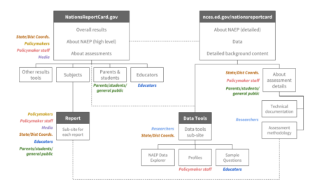 The diagram below shows NAEP’s digital presence when we began the process of realigning the program’s various properties. Each box was a separate property, with its own special features and particular audiences, and with only general branding tying it to the others.