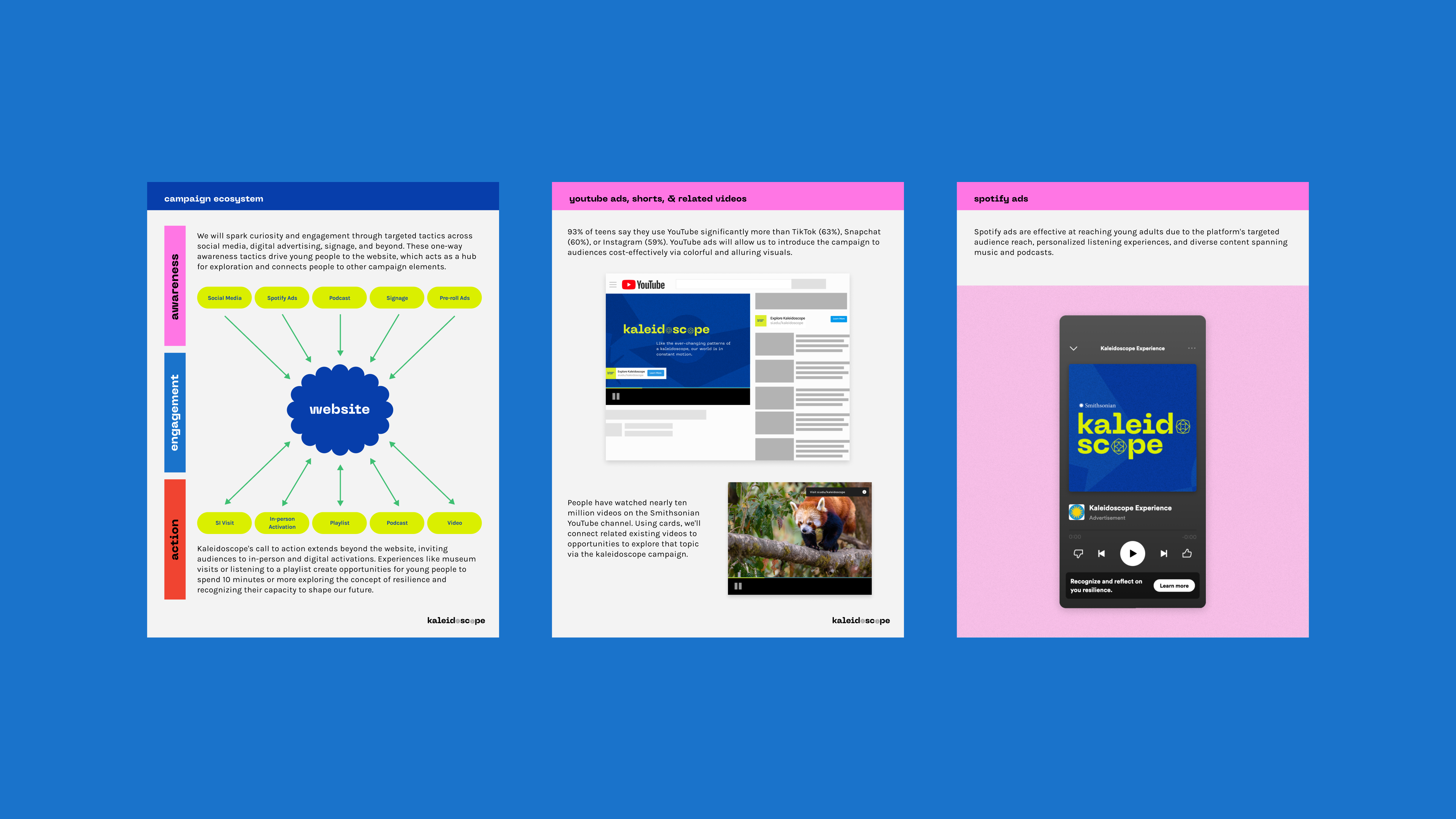 At the heart of the initiative is a bilingual website (English and Spanish) that serves as a digital hub, allowing users to explore the exhibit, share content on social media, and discover connections across Smithsonian museums. Every element was designed to reflect the brand identity we created for Kaleidoscope—an identity co-created with Gen Z and younger Millennials to ensure authenticity and relevance.